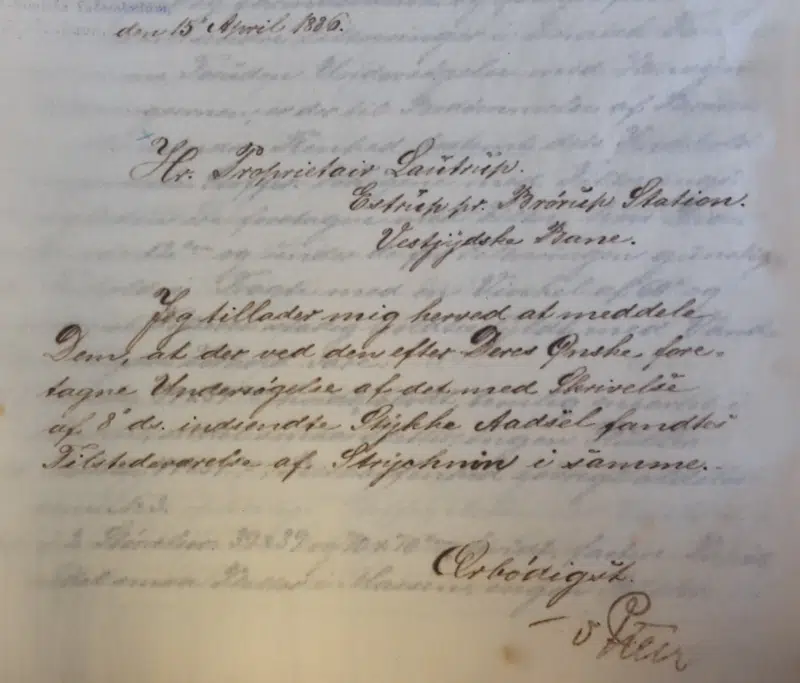 Jeg tillader mig herved at meddele Dem, at der ved den efter Deres ønske foretagne Undersøgelse af det med Skrivelse af 8 ds. indsendte Stykke Aadsel fandtes Tilstedeværelse af Strycknin i samme.
