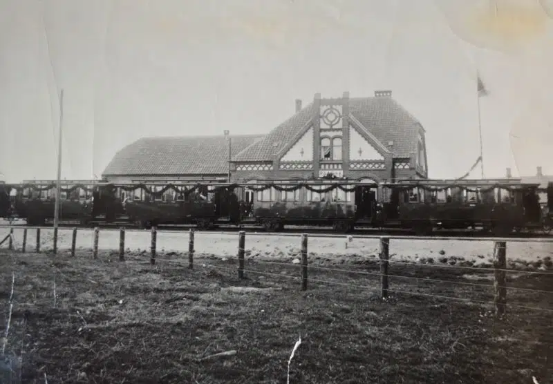 Rødding station, indviet 1899 - med guirlander på togvogne. Foto: Rødding Lokalhistoriske Arkiv.